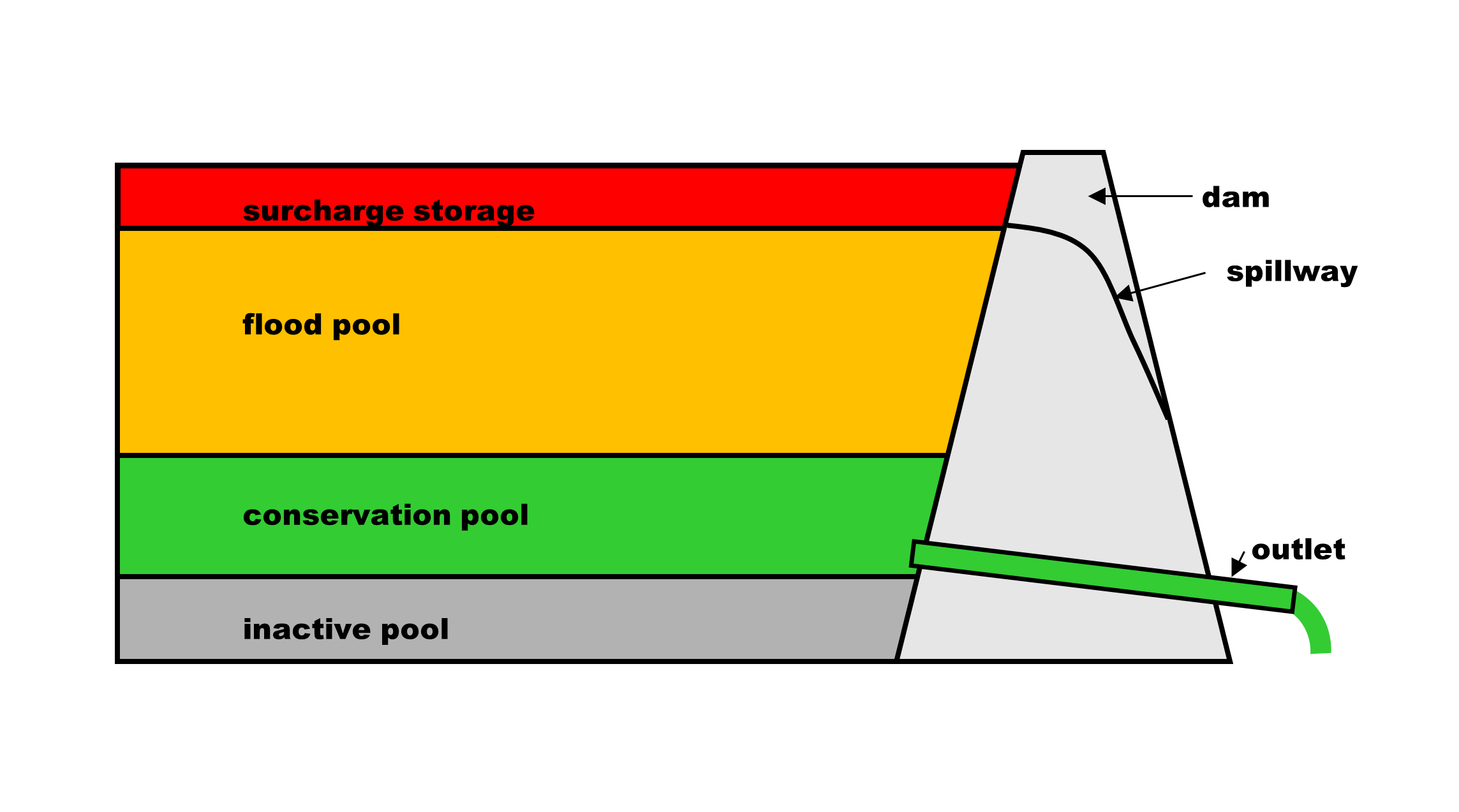 The types of pool in flood control lakes are inactive pool, conservation pool, seasonal pool, flood pool, and surcharge pool. Arkansas River locks and dams are limited to one kind of pool: navigation pool.[1]